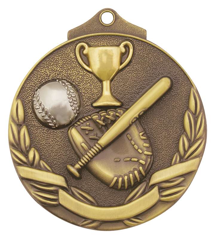 Classic wreath inspired medal for Baseball / Softball. A generic theme suitable for all players features the iconic ball and celebratory wreath representing high achievement.
