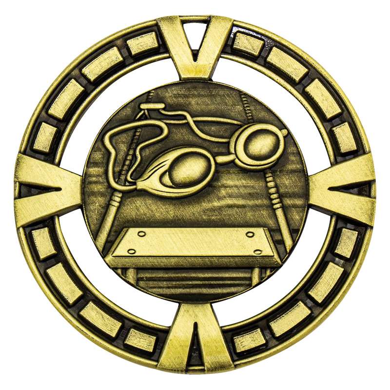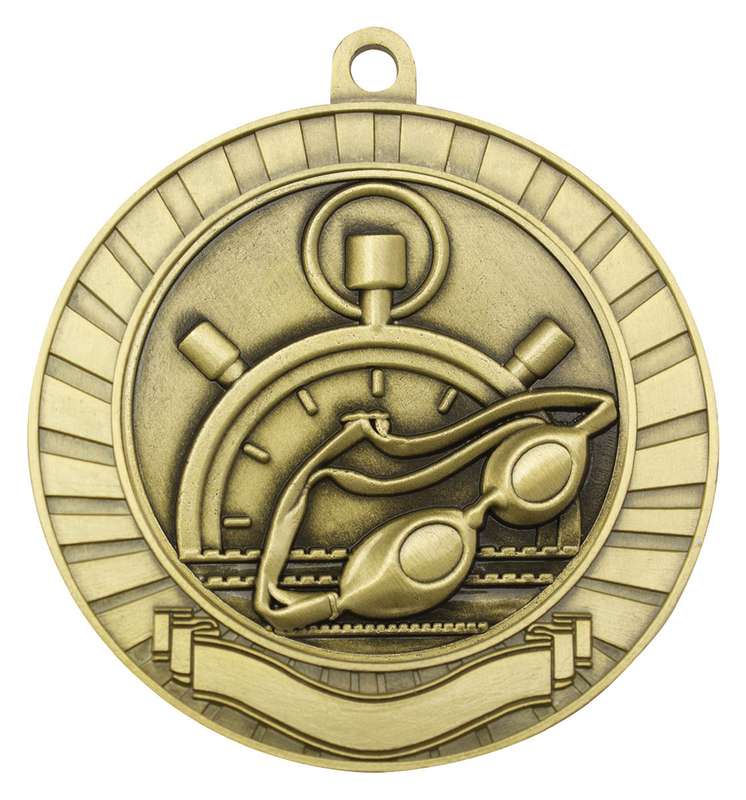 Painted series of medals offer vibrant and colourful designs in gold, silver and bronze. Swimming medal design features male and female swimmers for a universal theme. All ribbon colours available and medal boxes to suit.