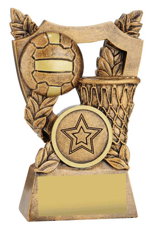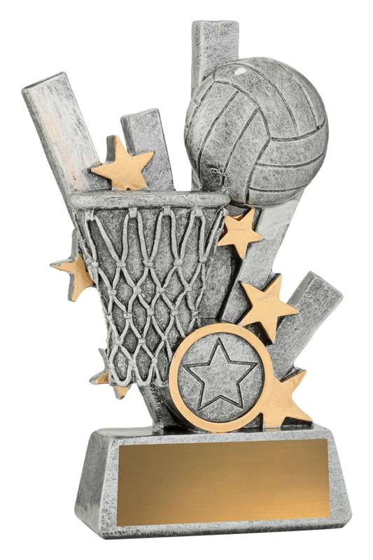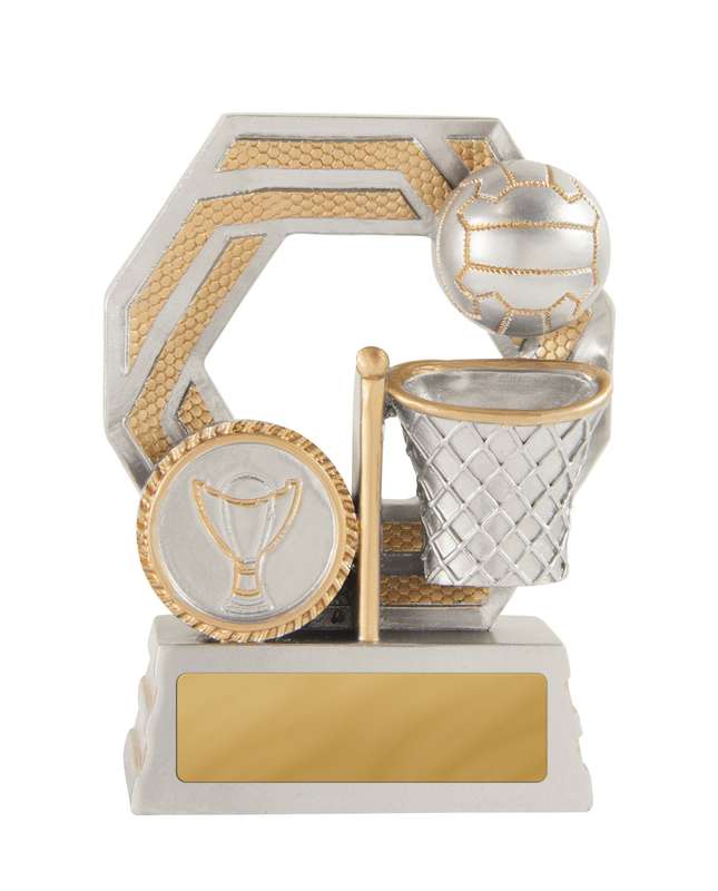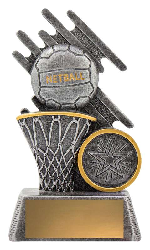Zoom Series showcases Netball player in action against a stylised backdrop and finished in classic antique silver. Available in multiple sizes and includes space for custom logo.